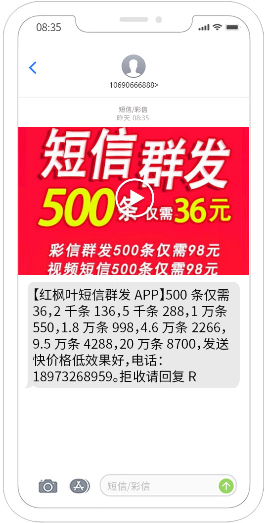 視頻短信發送能夠覆蓋移動、聯通、電信用戶,正規集團視頻短信通道,快速、可靠、穩定、形象好,能快速將您的訊息投放到用戶的手機。